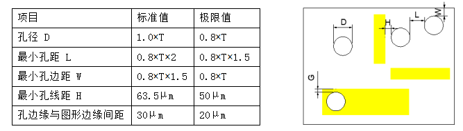 孔徑與基片厚度的最佳比例為1:1,可加工的最小金屬化通孔孔徑為基片厚度的0.8倍,孔位最小偏差為50μm,詳細(xì)要求如下(T為基片厚度):